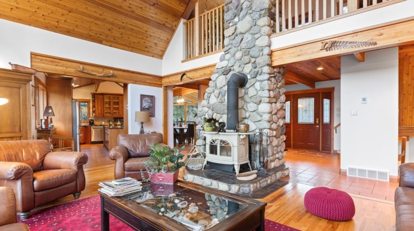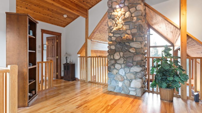 - Custom river-rock fireplace as a cozy focal point