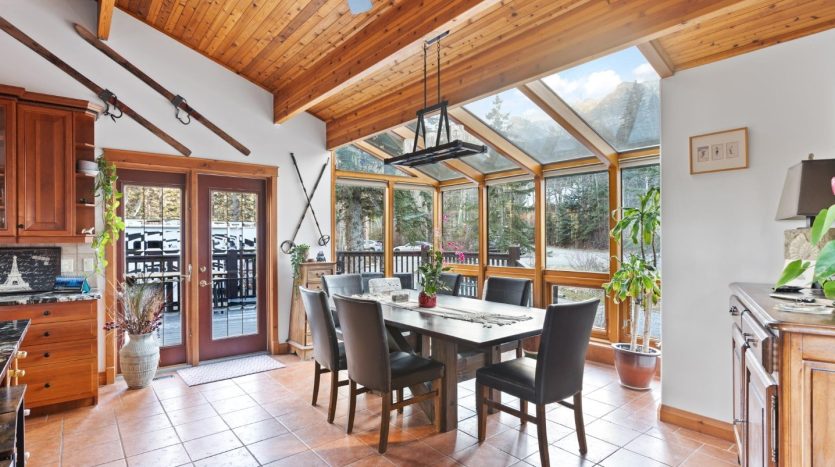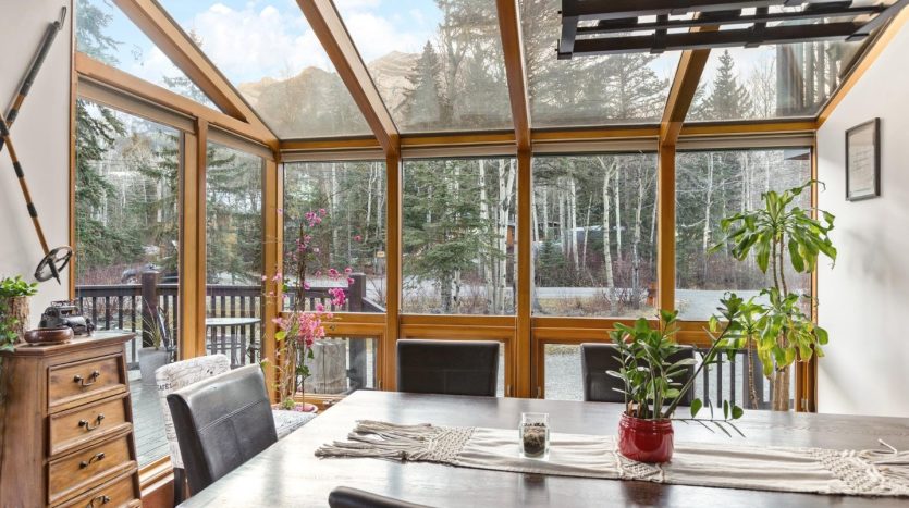 - Sunny solarium-style dining area showcasing the mountain views